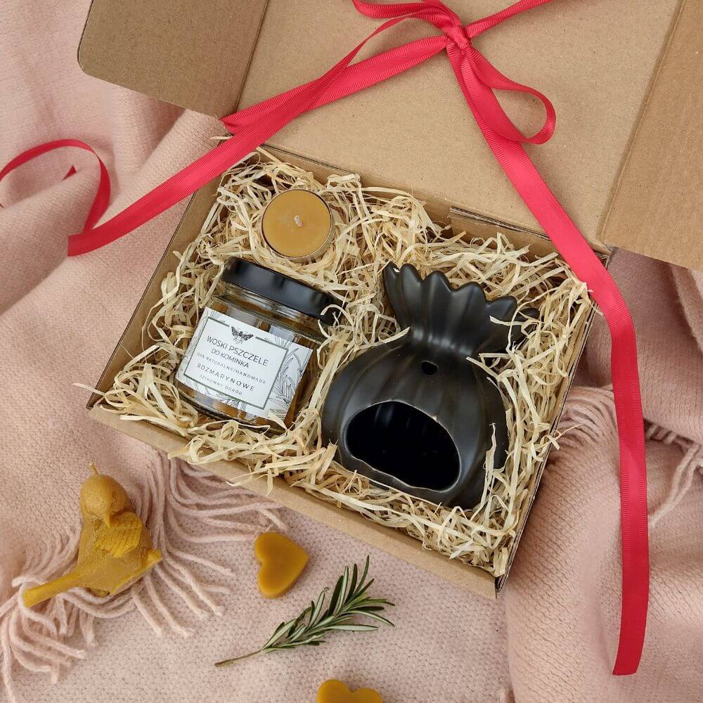 Aromatyczny zestaw składający się z czarnego kominka, tealighta  i wosków o zapachu naturalnym, lawendowym i rozmarynowym do wyboru. Piękny prezent, który umili czas spędzony w domu.