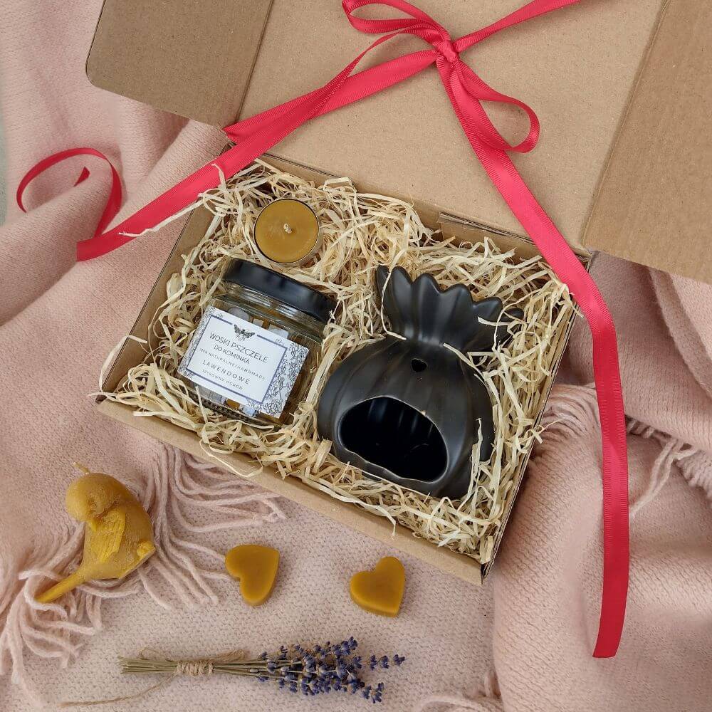 Pachnący miodem zestaw, w skład którego wchodzi ceramiczny czarny kominek na wosk lub olejek zapachowy oraz wybrane woski.